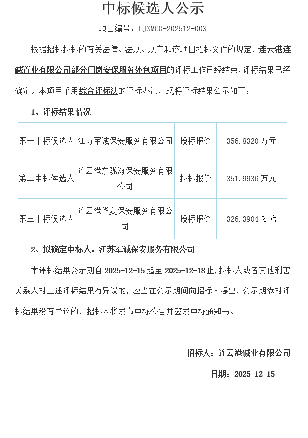 連云港連堿置業(yè)有限公司部分門崗安保服務(wù)外包項(xiàng)目中標(biāo)候選人公示
