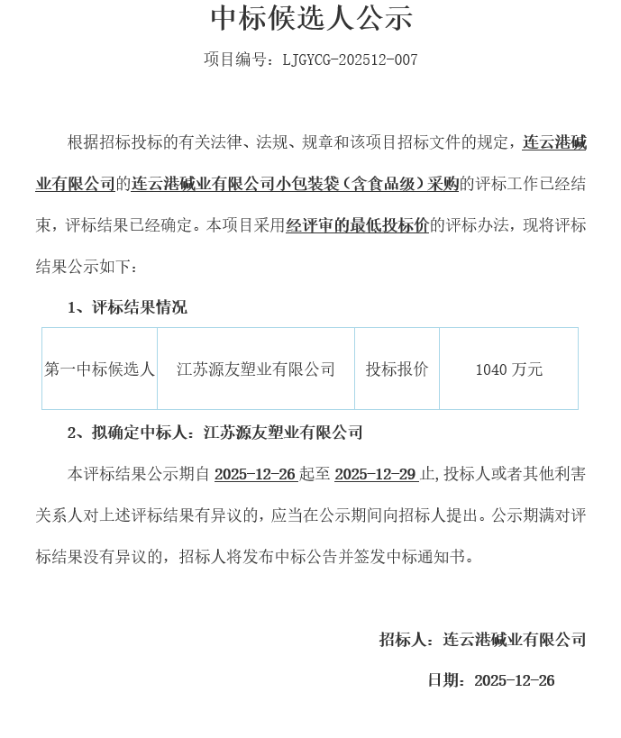 連云港堿業(yè)有限公司的連云港堿業(yè)有限公司小包裝袋(含食品級)采購中標候選人公示