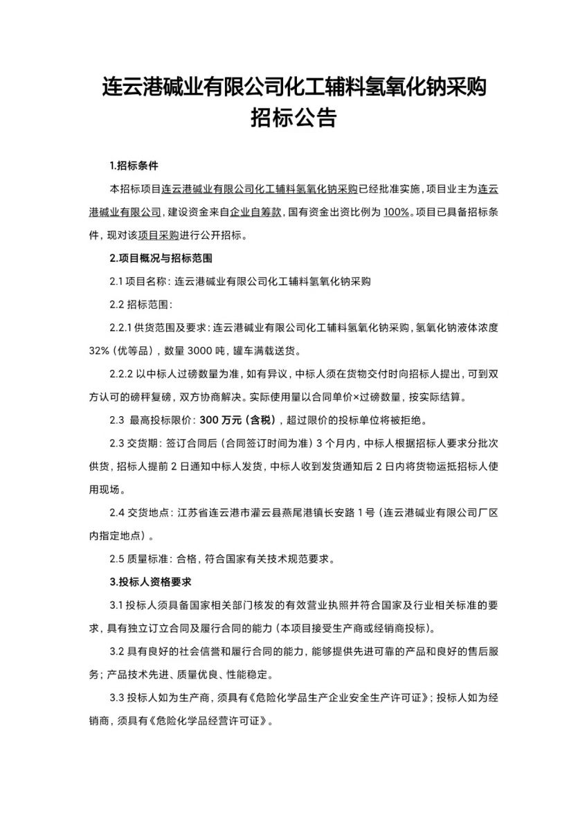 連云港堿業(yè)有限公司化工輔料氫氧化鈉采購(gòu)招標(biāo)公告