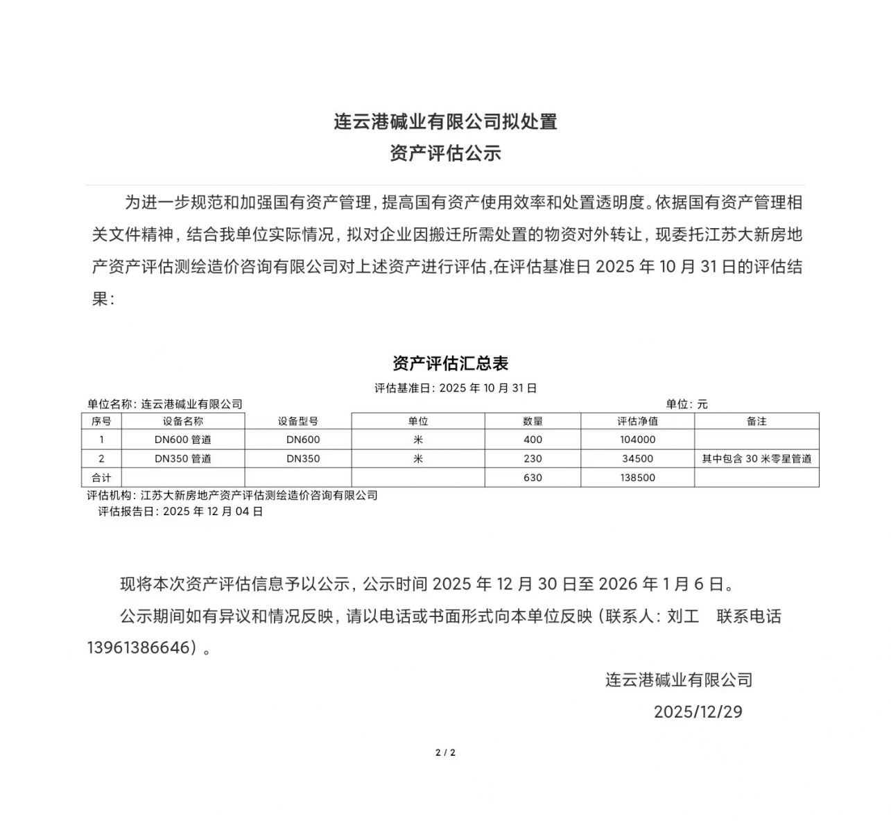 連云港堿業(yè)有限公司老廠區(qū)報廢管道設備資產(chǎn)評估公示