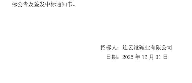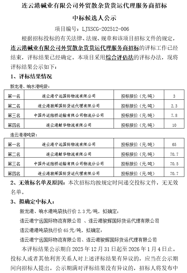 連云港堿業(yè)有限公司外貿(mào)散雜貨貨運代理服務(wù)商招標中標候選人公示