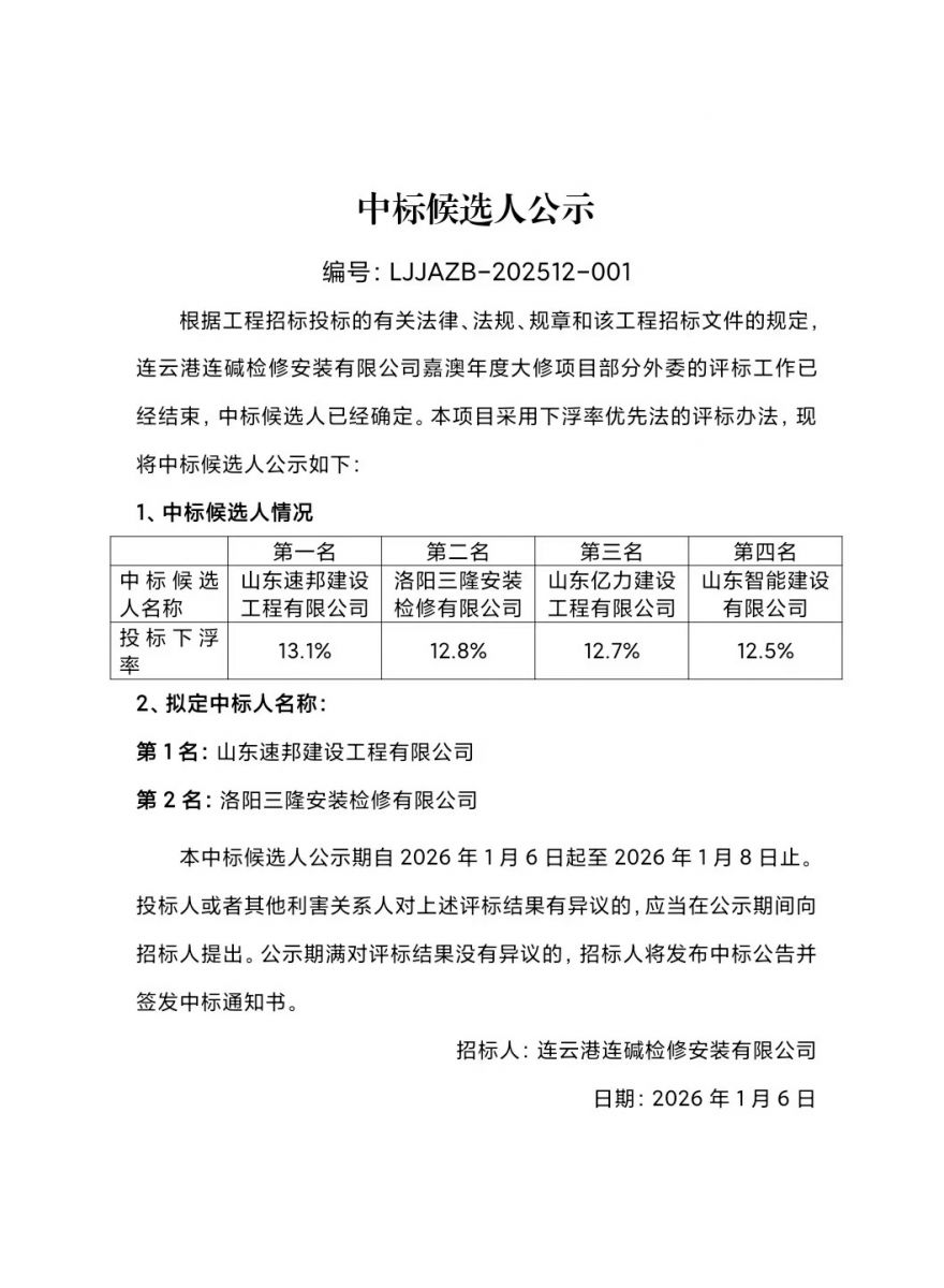 連云港連堿檢修安裝有限公司嘉澳年度大修項(xiàng)目中標(biāo)候選人公示